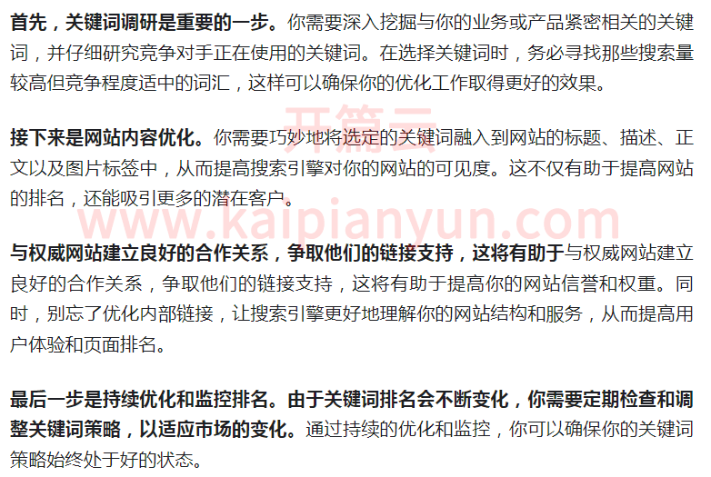 開篇云認為網站關鍵詞優化推廣的主要步驟包括:網站關鍵詞調研、網站內容優化、網站鏈接建設及持續優化監控。