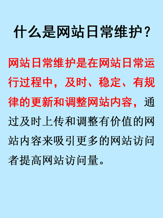 什么是網(wǎng)站日常維護(hù)?網(wǎng)站日常維護(hù)是在網(wǎng)站日常運(yùn)行過程中,及時(shí)、穩(wěn)定、有規(guī)律的更新和調(diào)整網(wǎng)站內(nèi)容,通過及時(shí)上傳和調(diào)整有價(jià)值的網(wǎng)站內(nèi)容來吸引更多的網(wǎng)站訪問者提高網(wǎng)站訪問量。