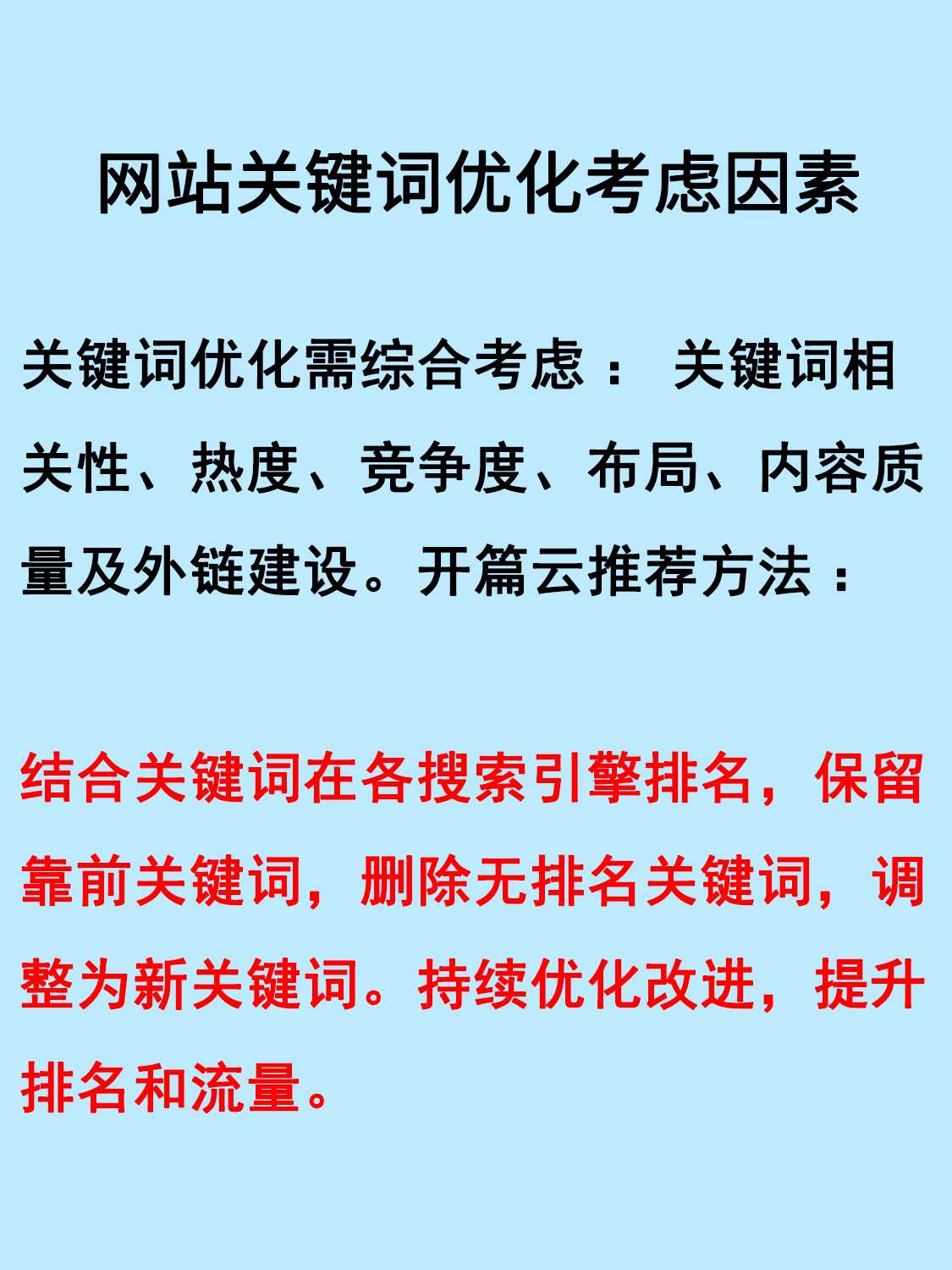 網站關鍵詞優化需綜合考慮:關鍵詞相關性、熱度、競爭度、布局、內容質量及外鏈建設。開篇云推薦方法:結合關鍵詞在各搜索引擎排名,保留靠前關鍵詞,刪除無排名關鍵詞,調整為新關鍵詞。持續優化改進,提升排名和流量。