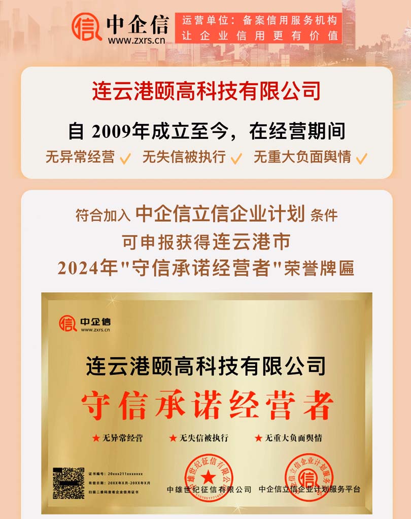 本公司自2009年成立至今,在經(jīng)營期間,無異常經(jīng)營,無失信被執(zhí)行,無重大負(fù)面輿情。符合加入中企信立信企業(yè)計(jì)劃條件,可申報(bào)獲得連云港市2024年守信承諾經(jīng)營者榮譽(yù)牌匾。