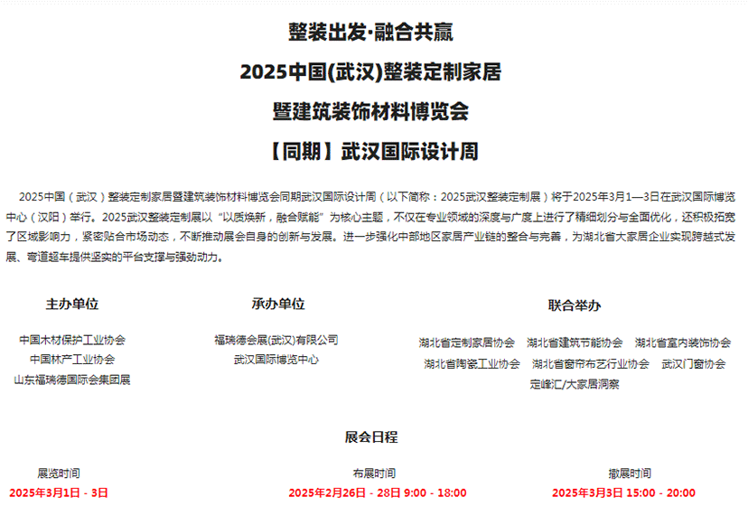 2025武漢整裝定制展將于2025年3月1—3日在武漢國際博覽中心(漢陽)舉行,緊密貼合市場動態,不斷推動展會自身的創新與發展。