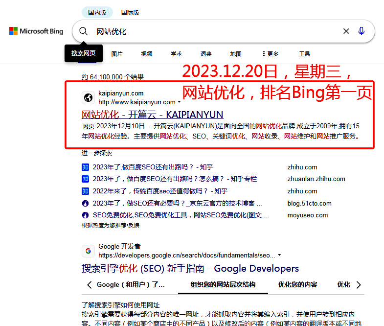 12月20日星期三,開篇云旗下網站,網站優化排名Bing第一頁。