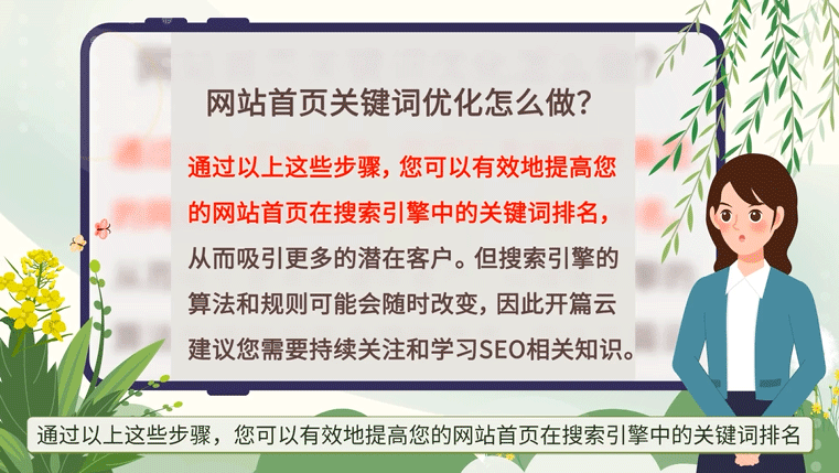 網站首頁關鍵詞排名優化是提升網站在搜索引擎中可見度的重要步驟。為了有效地進行首頁關鍵詞排名優化,以下是開篇云的一些建議: