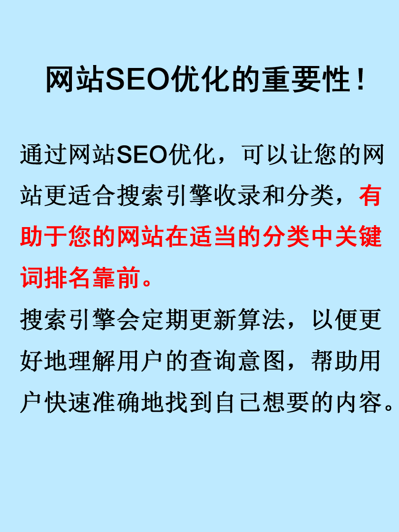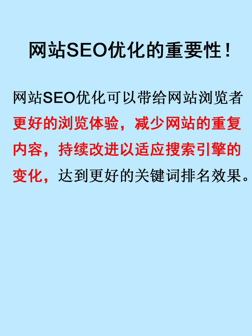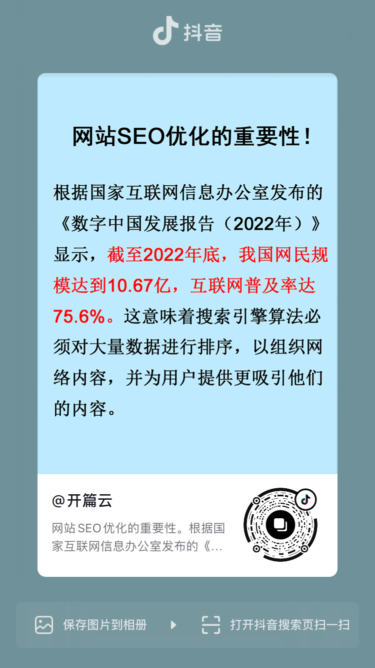 根據(jù)國家互聯(lián)網(wǎng)信息辦公室發(fā)布的《數(shù)字中國發(fā)展報告(2022年)》顯示,截至2022年底,我國網(wǎng)民規(guī)模達到10.67億,互聯(lián)網(wǎng)普及率達75.6%。網(wǎng)站SEO優(yōu)化可以帶給網(wǎng)站瀏覽者更好的瀏覽體驗,減少網(wǎng)站的重復(fù)內(nèi)容,持續(xù)改進以適應(yīng)搜索引擎的變化,達到更好的關(guān)鍵詞排名效果。