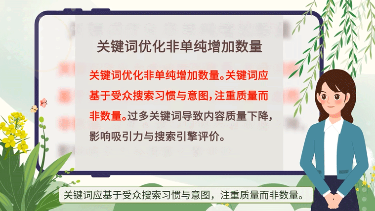 關(guān)鍵詞優(yōu)化并非關(guān)鍵詞數(shù)量越多效果越好。關(guān)鍵詞應(yīng)基于受眾搜索習慣與意圖,注重質(zhì)量而非數(shù)量。過多關(guān)鍵詞導致內(nèi)容質(zhì)量下降,影響吸引力與搜索引擎評價。